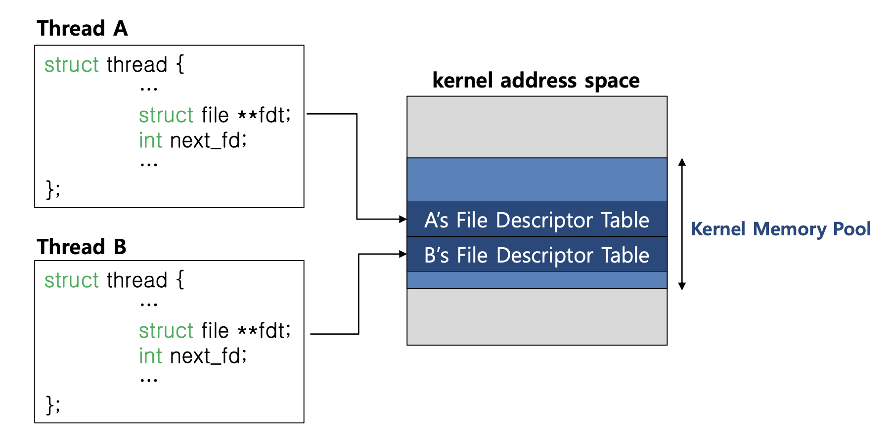 - 해당 fd table은 사용자 영역이 아니라 커널 영역에 할당된다. (핀토스 기준으로, palloc_get_page 인자로 PAL_USER 옵션을 주면 사용자 영역에 할당할 수 있다.)