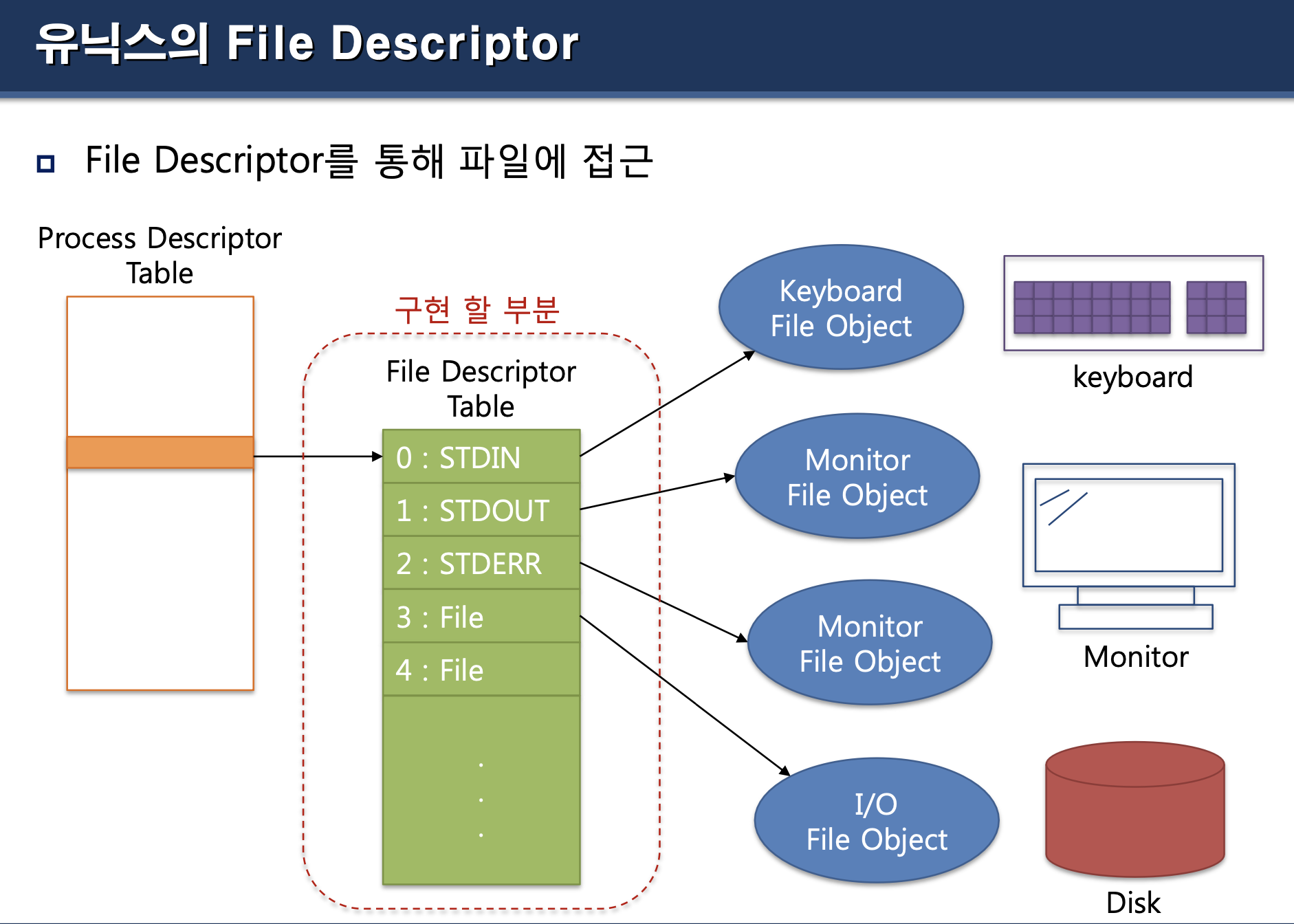 - 그 외의 시스템 콜들은 fd(파일 디스크립터)를 인자로 받는다는 점이다.