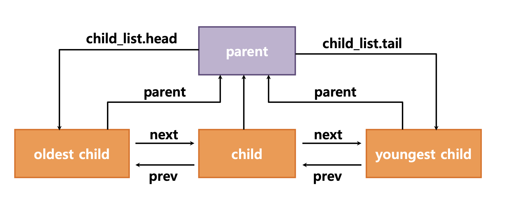 부모 프로세스는 자식 프로세스 디스크립터를 리스트를 이용하여 관리한다.