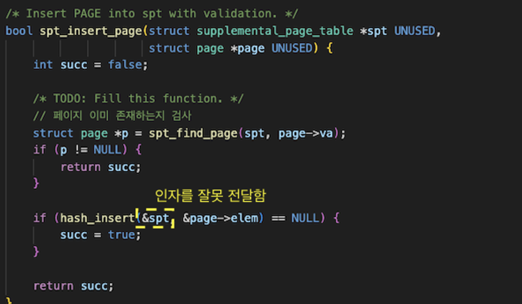 - hash_insert()는 첫번째 인자로 hash 구조체를 받아야 하는데, spt를 줬다.