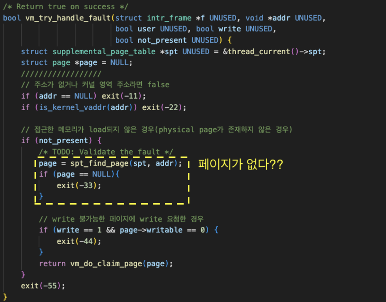2. Page fault 핸들링 때, spt에서 페이지를 찾지 못하는 문제