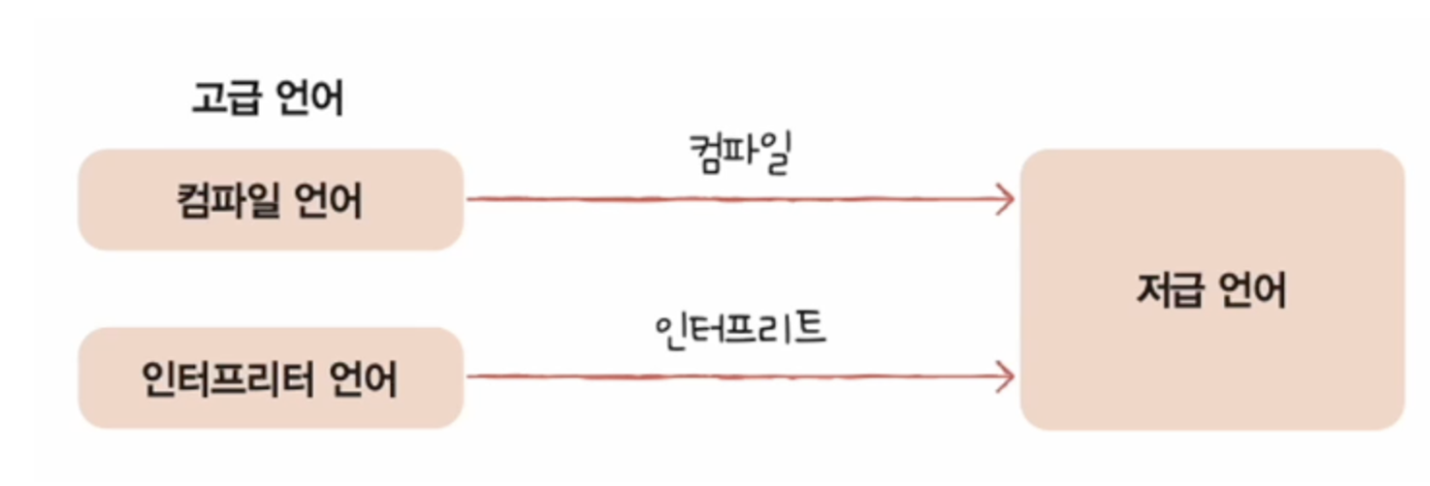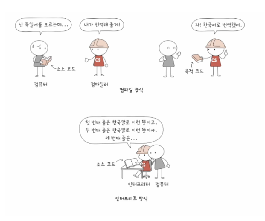 - 그러나 칼로 무 자르듯 딱 나뉘는 것은 아니고(파이썬은 A, 자바는 B ..), 그냥 컴파일 방식과 인터프리터 방식 두 가지가 있다고 이해하는 편이 낫다