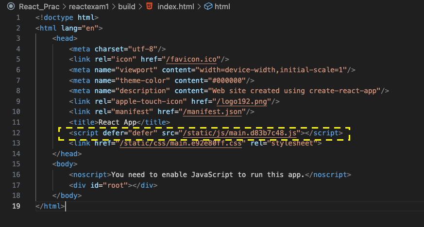 결과적으로 리액트 애플리케이션의 모든 자바스크립트 코드와 라이브러리를 포함하는 주요 파일을 참조하고 있게 된다.