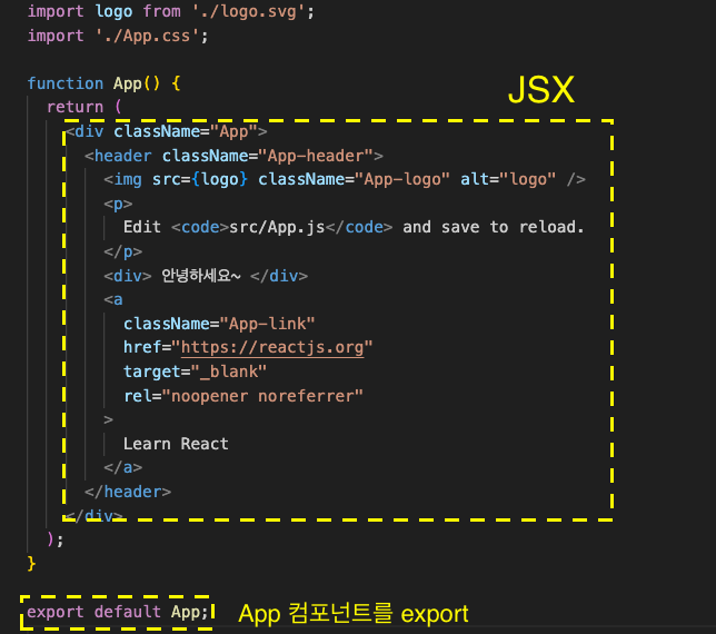 - App.js 파일은 함수형 컴포넌트인 App을 정의하고 있다. 이 컴포넌트는 JSX를 반환한다.