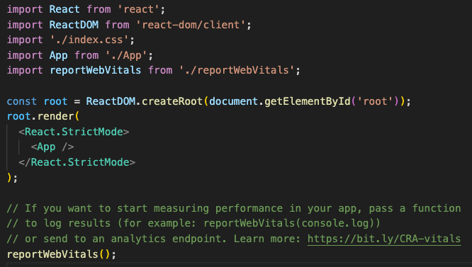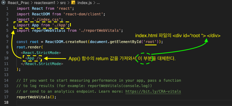 - index.js 파일에서 ReactDOM.createRoot 함수를 호출하고, document.getElementById('root')를 통해 index.html 파일 내의 <div id="root"></div> 요소를 찾는다. 이 요소는 React 애플리케이션의 마운트 포인트이다.