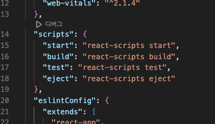 프로젝트 파일의 package.json에 들어가거 scripts 섹션을 보면, 우리가 npm start 할 때 start가 "react-scripts start" 라는 커맨드로 지정되어 있음을 확인할 수 있다.