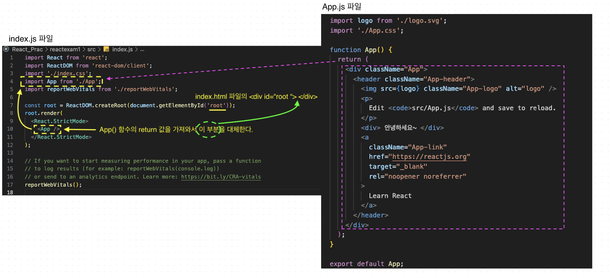 - 앱 렌더링 - index.js 파일, App.js 파일: