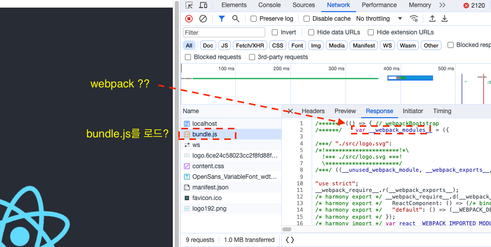 아마 위에서 본 bundle.js 와 webpack이라는 키워드는 이 내용 안에서, 더 내부적인 메커니즘에 의해 나온 결과일 것으로 생각된다.