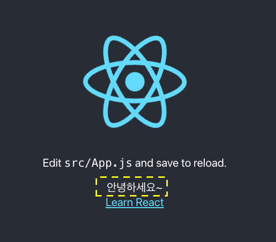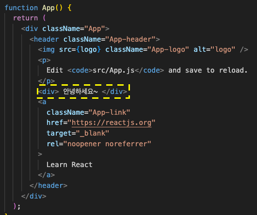 그리고 App.js 에 가보면 html 코드같은 부분(JSX 문법)이 있는데, 여기에 수정을 가하면 렌더링되는 화면에도 변화가 생긴다.