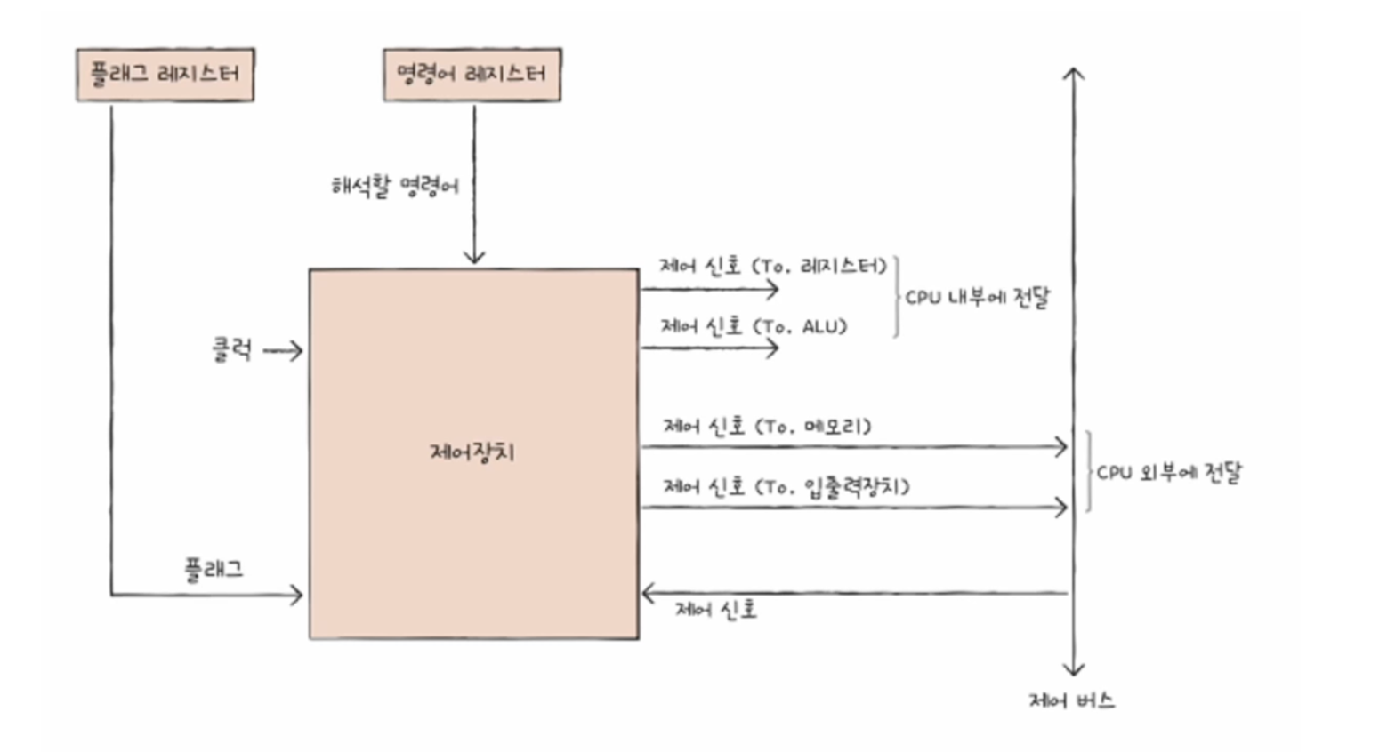 - 제어장치: 제어 신호를 발생시키고 명령어를 해석하는 장치