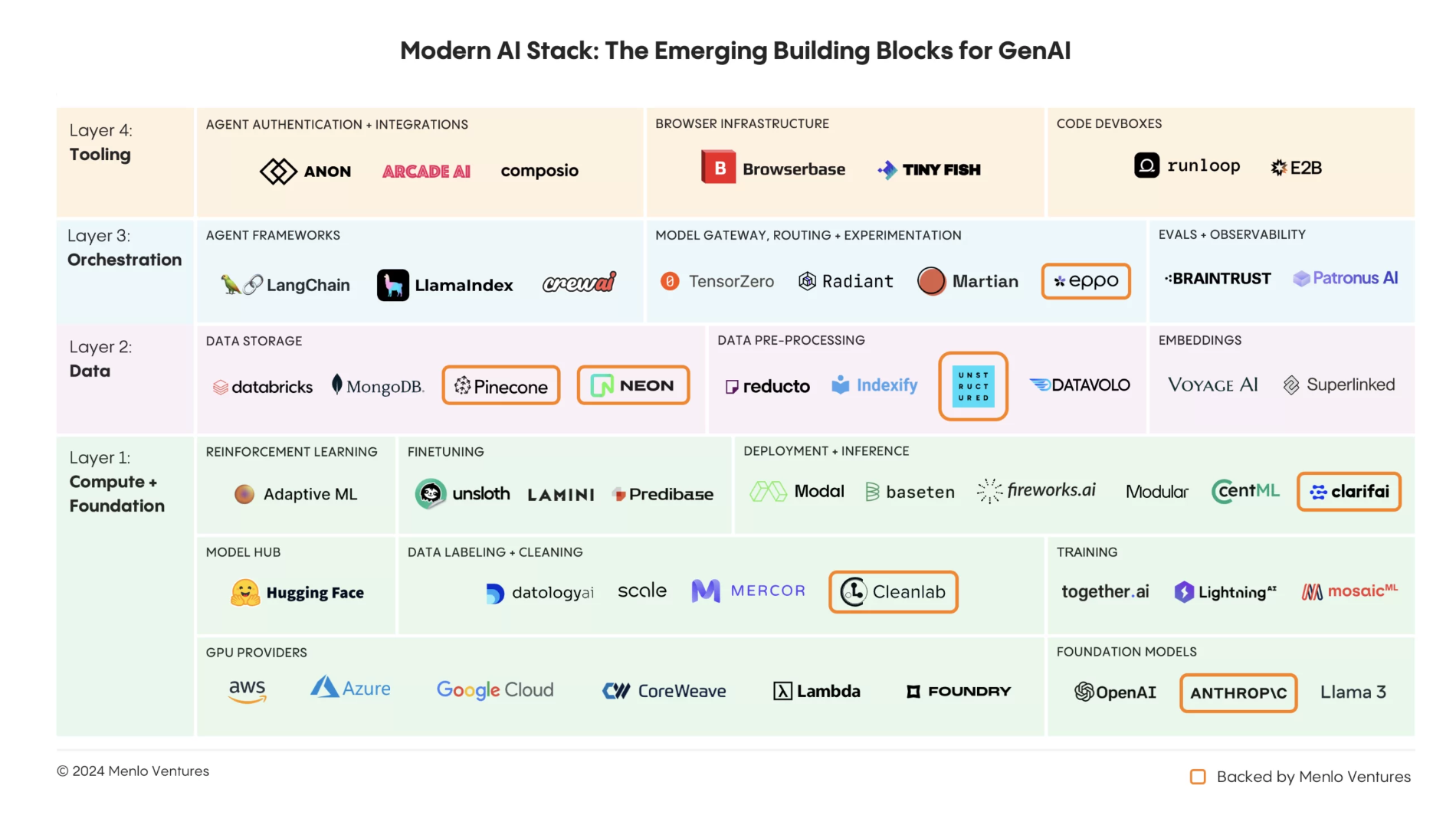 2024년 현대 AI 스택은 안정화 단계에 접어들며, 대부분의 생산 AI 시스템의 런타임 아키텍처를 구성하는 핵심 빌딩 블록을 중심으로 기업들이 통합되고 있습니다.