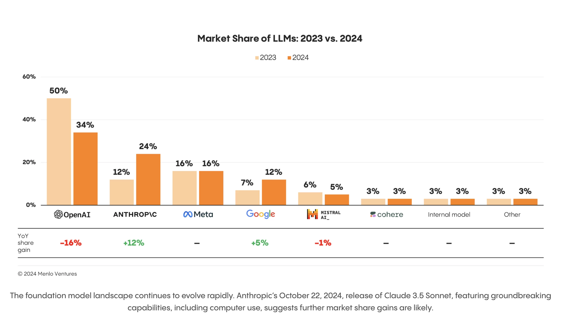 파운데이션 모델 환경은 계속해서 빠르게 진화하고 있습니다. 2024년 10월 22일 출시된 Anthropic의 Claude 3.5 Sonnet은 획기적인 기능(예: 컴퓨터 사용 능력)을 포함하고 있어, 추가적인 시장 점유율 증가 가능성이 높습니다.