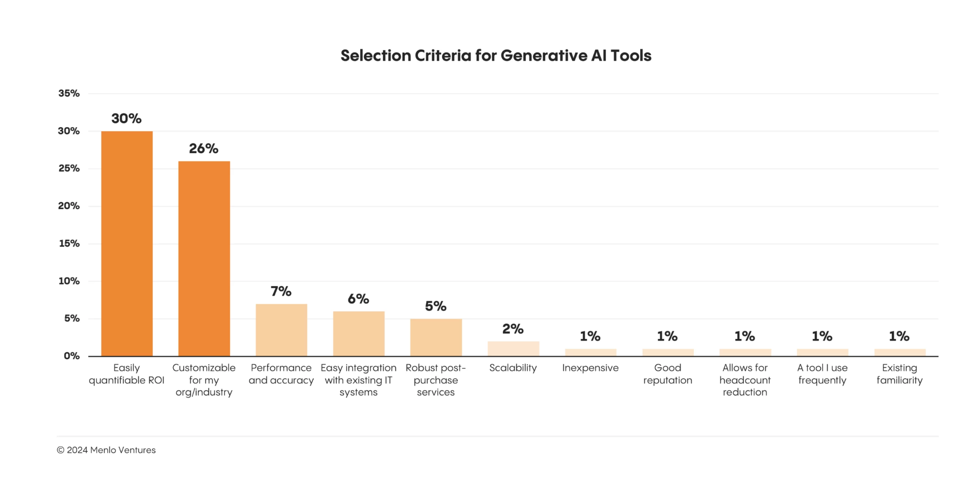 생성형 AI 애플리케이션을 선택할 때, 기업들은 ROI(투자 대비 수익)와 산업별 맞춤화를 가장 중요한 요소로 꼽습니다. 놀랍게도 가격은 주요 우려 사항이 아니며, 조사된 기업 리더 중 단 1%만이 가격을 우려 사항으로 언급했습니다.