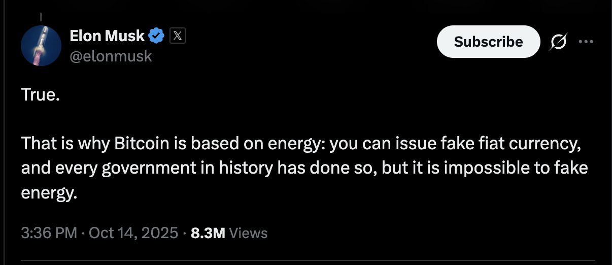 2025년 말, 한 팟캐스트에 출연한 일론 머스크가 '에너지가 곧 진정한 화폐다. 그래서 비트코인이 에너지에 기반한 것이다' 라는 언급을 한다.