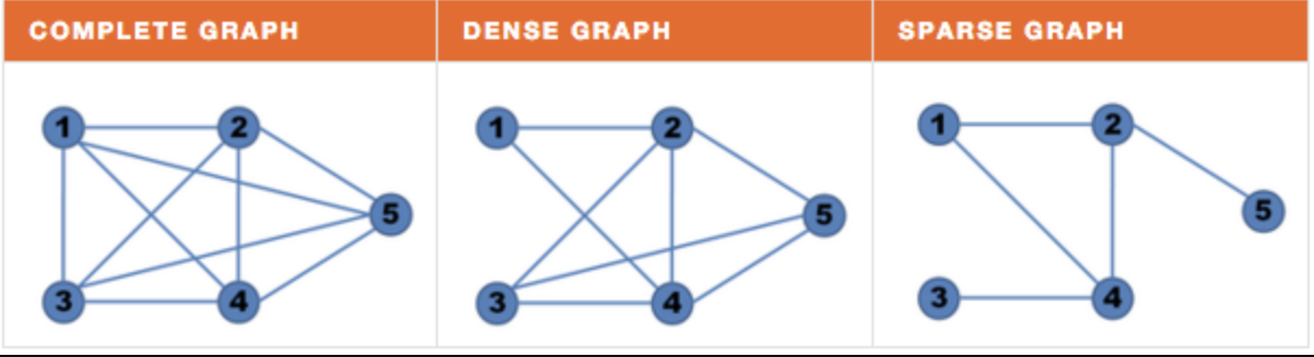 | 밀집 그래프 (Dense Graph) | 가능한 최대 간선 수에 근접한 수의 간선을 가진 그래프. 정확한 기준은 없는 듯. Introductions to Algorithms에 따르면, |E| 값이 |V|^2에 가까울수록 밀집 |
