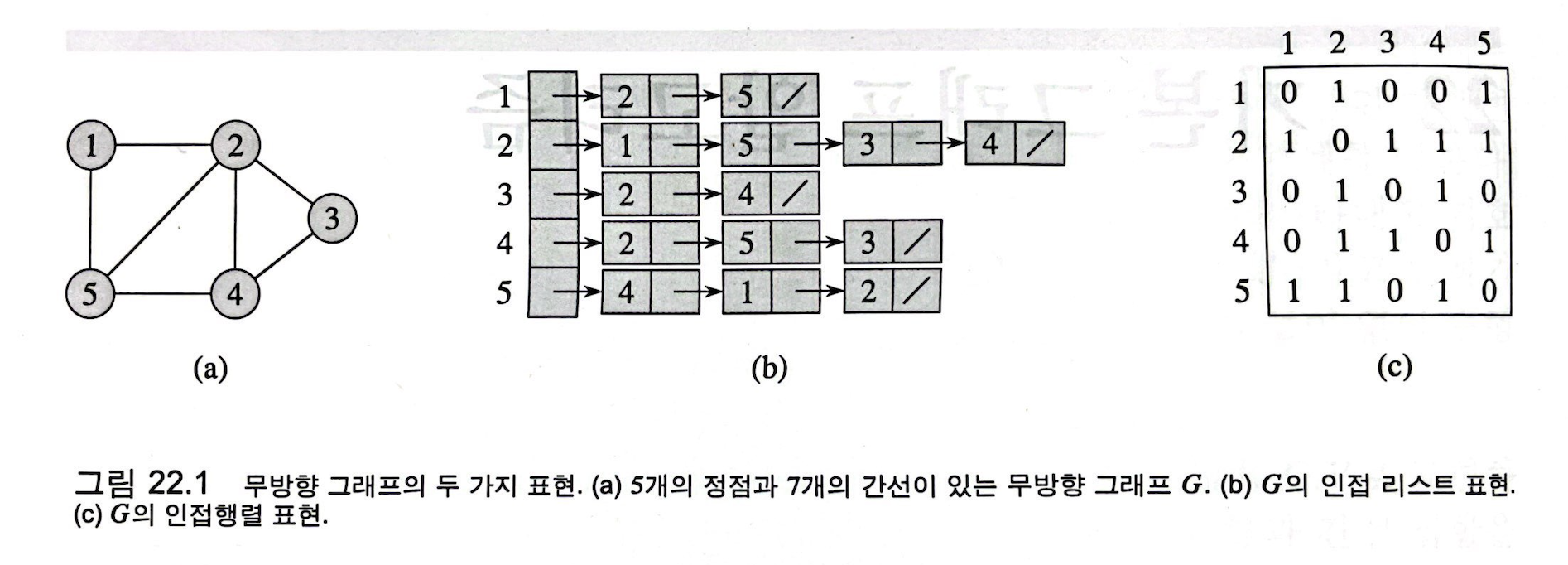 # 인접 행렬법을 통한 무방향 그래프 표현 (그림 22.1)