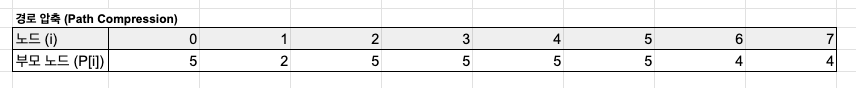 - Path Compression(경로 압축): find(i) 수행시, i의 루트 노드를 찾는 과정에서 만나는 모든 노드의 부모 노드를 루트 노드로 통일시켜준다.