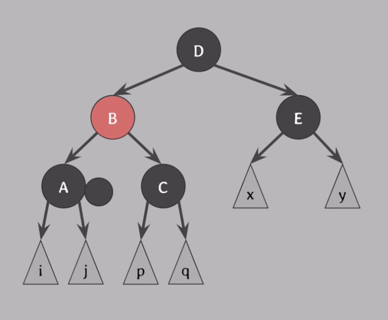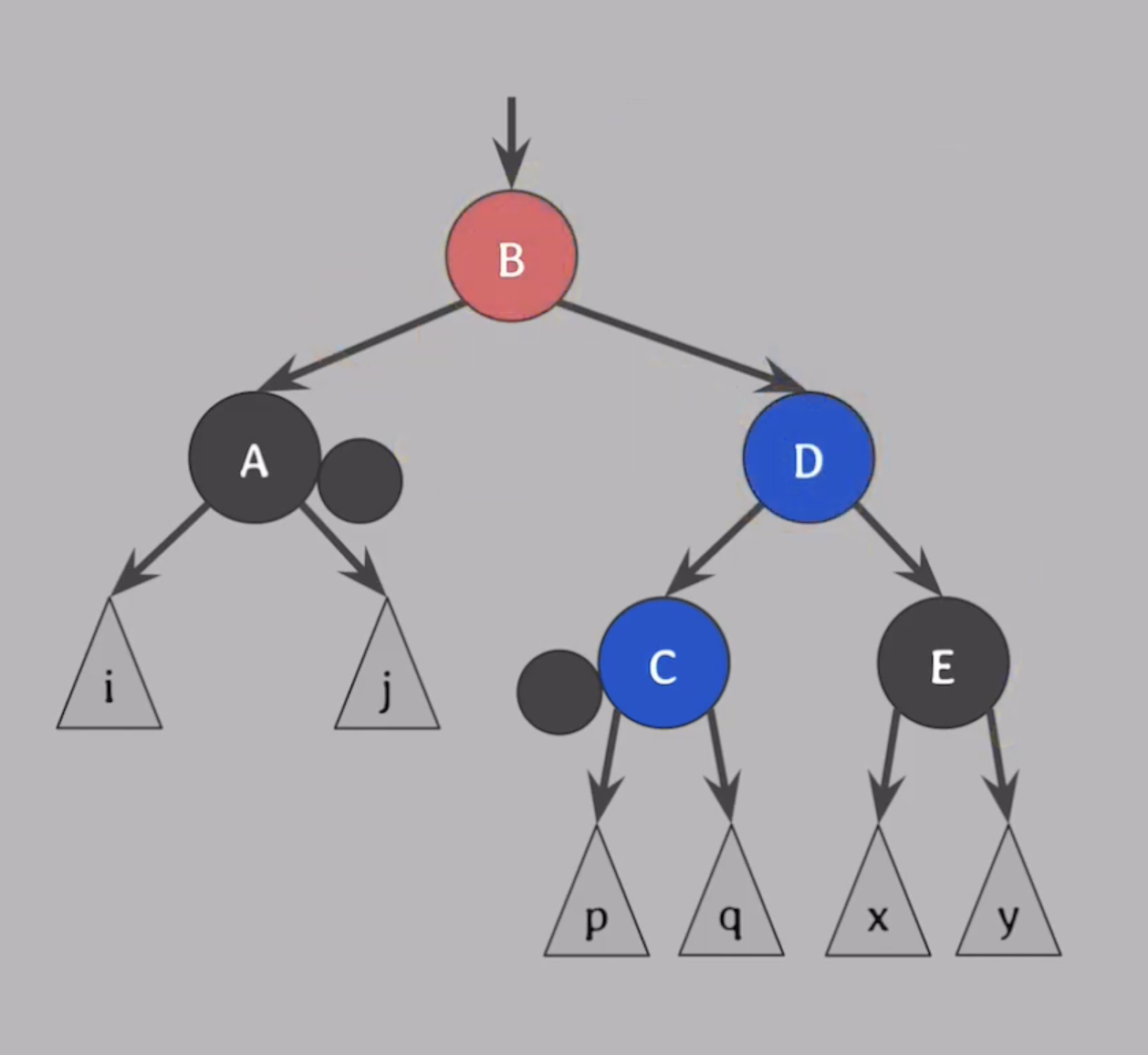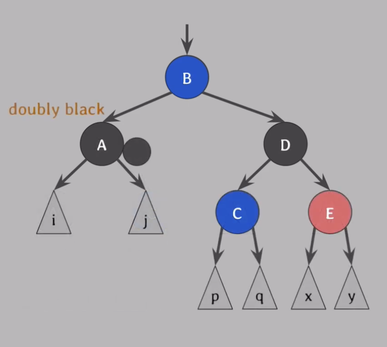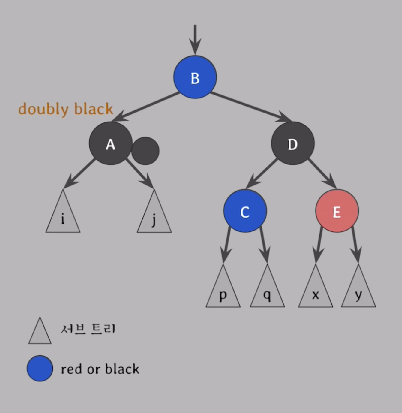 - 이때, red일수도 black일수도 있는 왼쪽 자식(C)은 extra black을 하나 받은 것으로 처리한다.