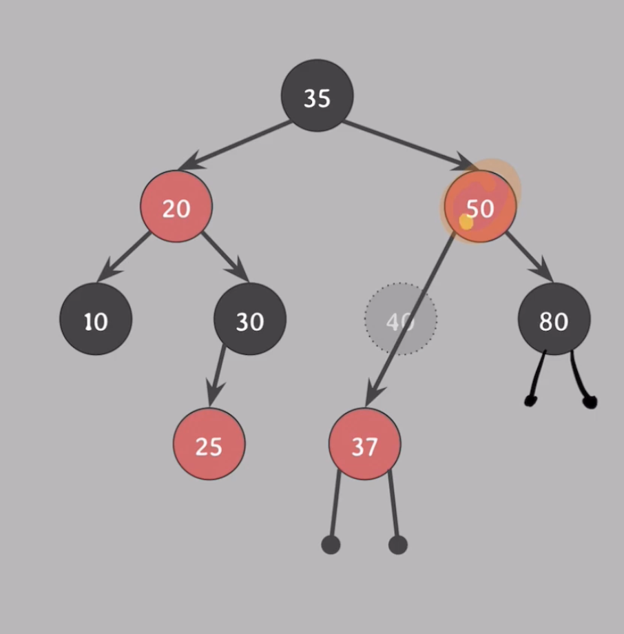위 케이스에서 40값 노드를 삭제하면 #4, #5 속성을 위반하게 된다. (red 연속, black height 어긋남)