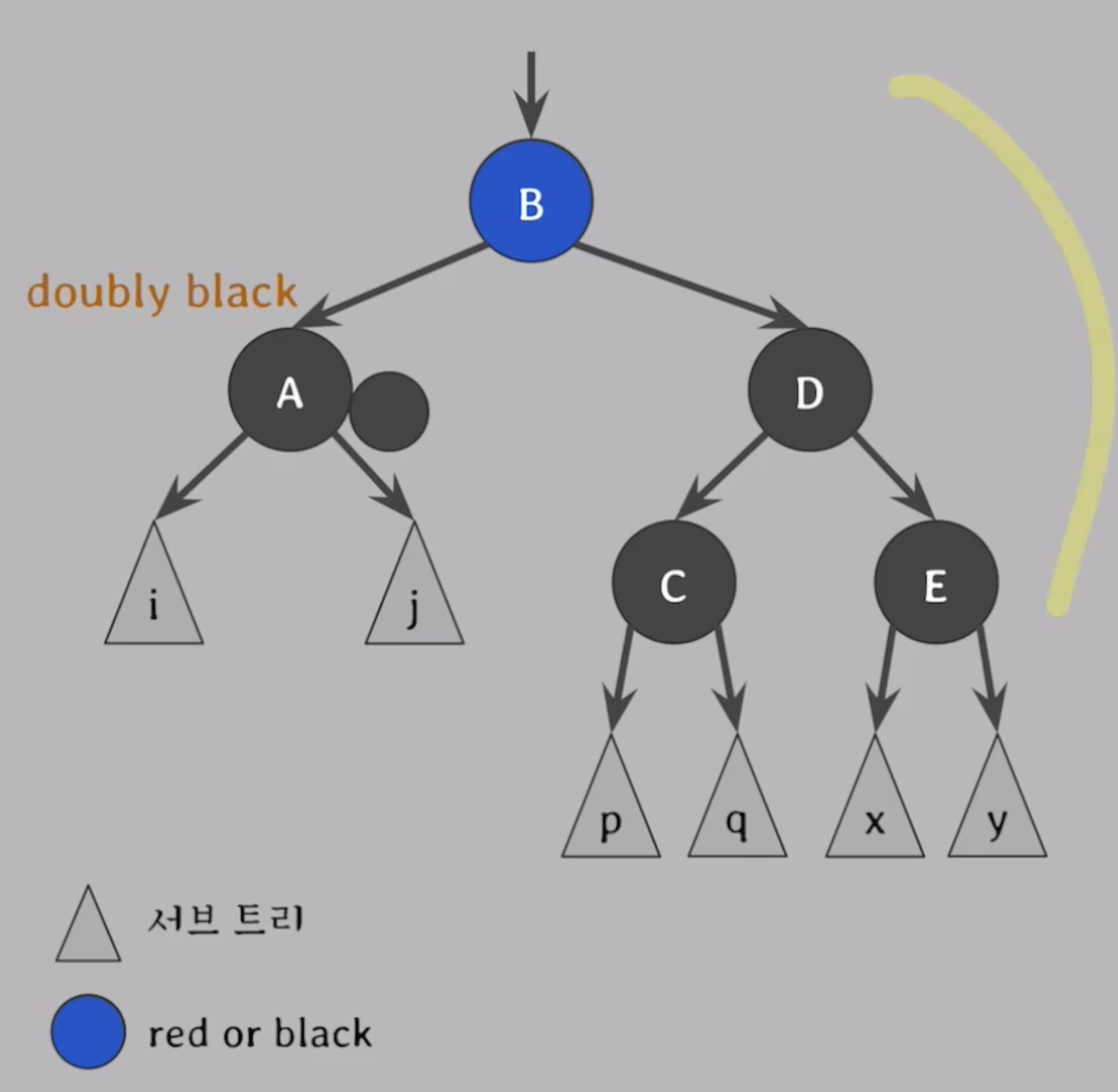 - double black: extra black이 부여된 black 노드. 따라서 black 2개로 카운트된다.