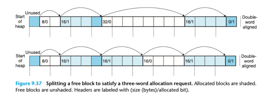 - 할당한 부분은 할당한 블록으로, 나머지는 새로운 free 블록으로 떨어져나간다.