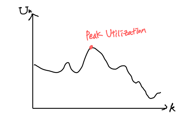 - 2차원 그래프를 통해 가장 마지막 요청이 k라고 하면, k번째 요청까지 오는 동안 U의 곡선을 그릴 수 있음. 그 최고점을 최고 이용도(U)로 정의하여, 이 수치가 높을수록 효율적인 할당기라고 부를 수 있다.