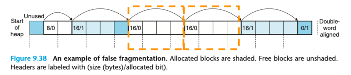 오류 단편화(false fragmentation): 분명 공간은 있는데 여러개로 쪼개져있는, 그래서 각각의 free 블록은 작은 경우이다.