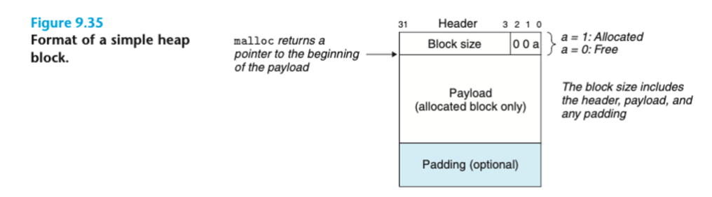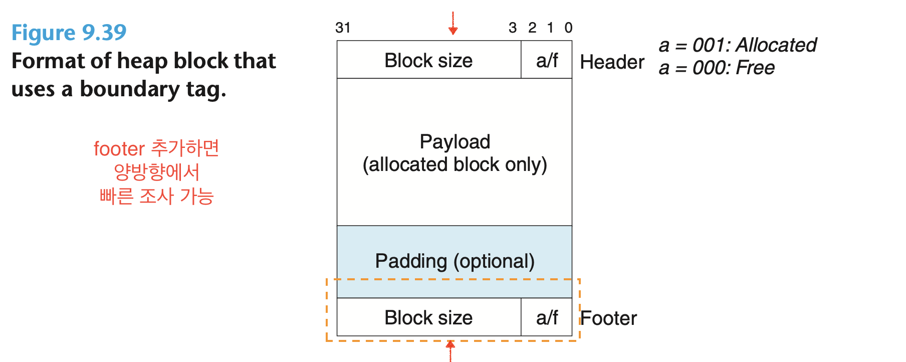 (더블 워드 경계에 맞추기: 블록 크기는 8의 배수가 되어야 함. 만약 9 바이트를 담으려면 16바이트를 할당한다.)