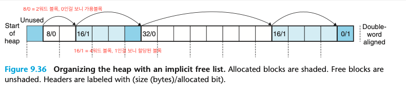 Implicit free list는 할당기를 위해 고안된 자료구조이며, 컴퓨터 시스템 책에서는 해당 가용 블록 형태를 먼저 다루고 있다.
