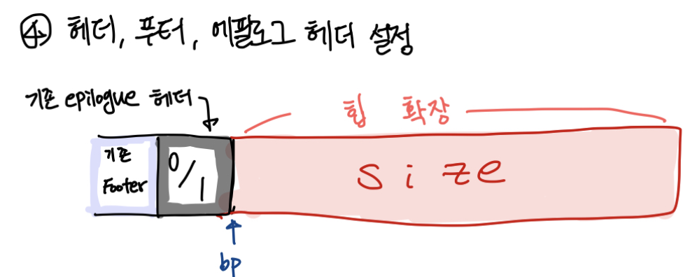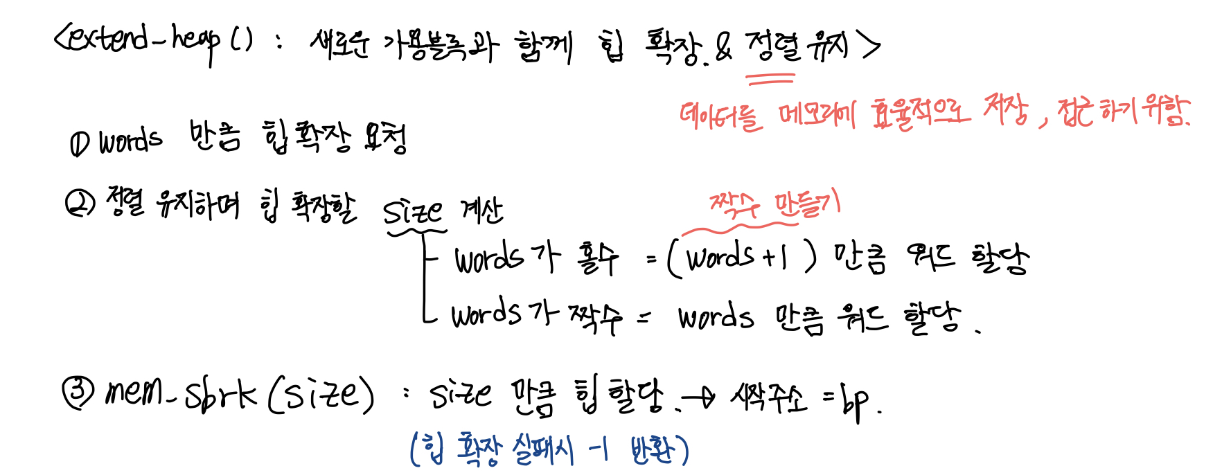 extend_heap은 적합한 블록 공간이 없을 때, 1) 새로운 힙 공간을 할당받고 2) 그곳에 블록 포맷을 세팅하는 함수이다.