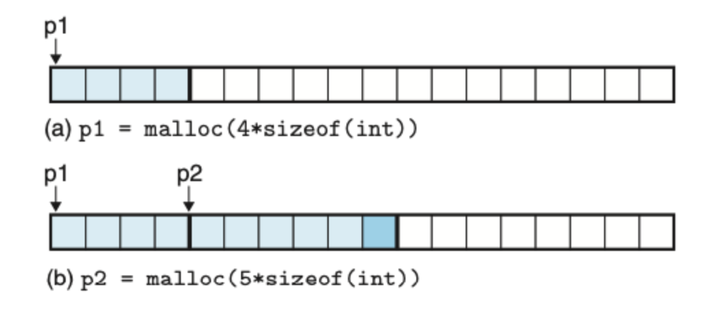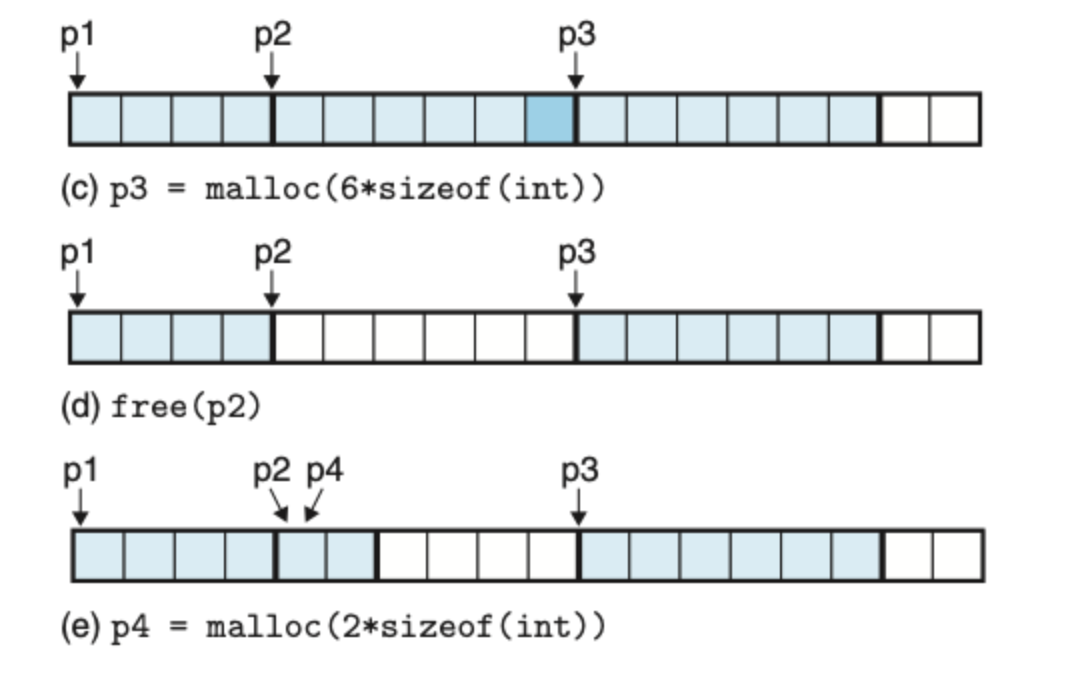 - 개발자가 realloc()을 요청하면, 우선 요청한 size만큼 새롭게 malloc 하고, 기존에 있던 데이터를 새롭게 할당한 블록들에 복사한다.