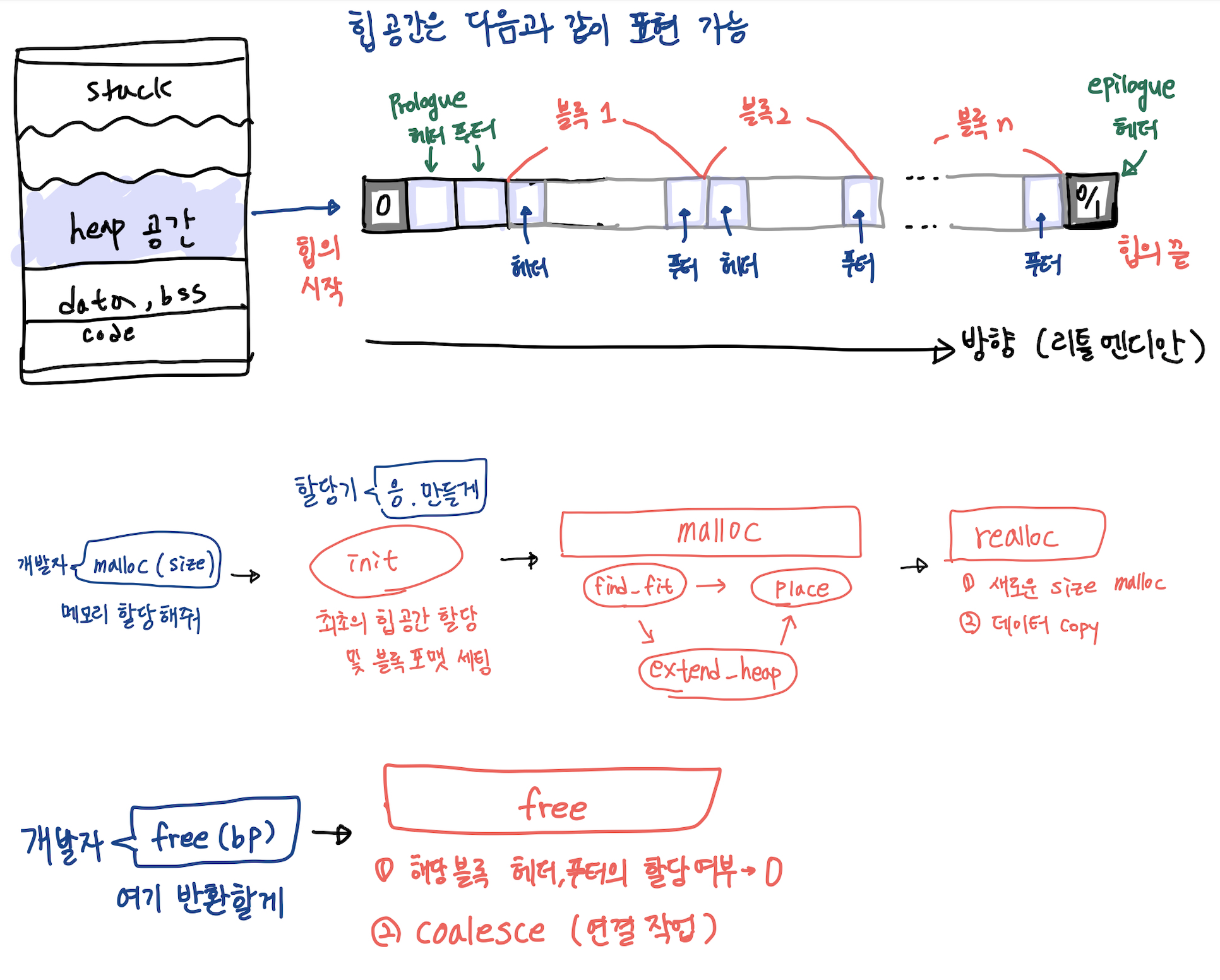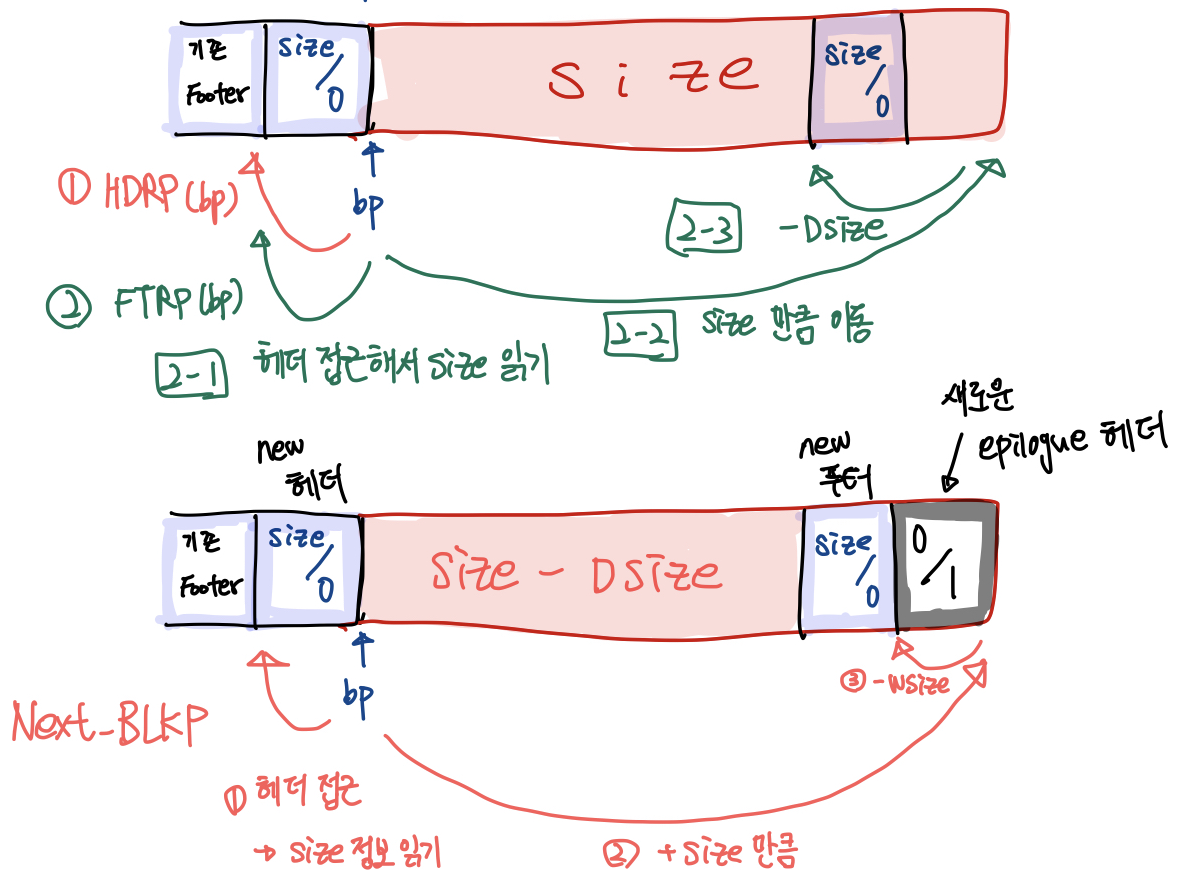 - 그 다음, 개발자가 malloc()을 요청하면 필요한 만큼의 공간이 있는지 확인하고(find_fit), 있다면 메모리 할당(place), 없다면 추가적인 힙 공간을 할당받는다.