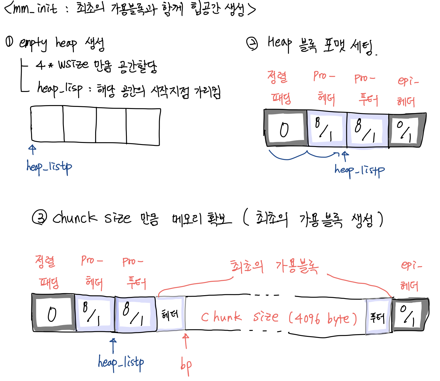 mm_init은 처음에 힙 공간을 할당받는 함수이다. 할당받은 공간에 최초의 가용 블록 포맷을 세팅한다.