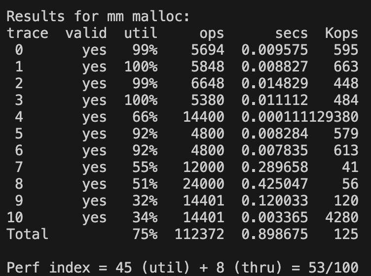 위와 같은 설계로 할당기를 구현했을 때 총점 53점이 나왔다. (ubuntu 환경 기준)