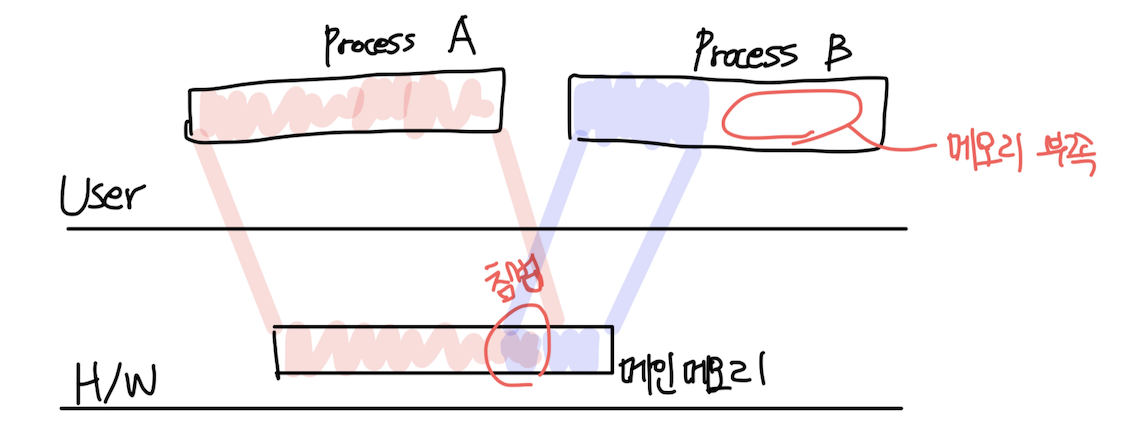 그러나 프로세스들이 존재하는 메모리가 여유가 없이 지나치게 많은 요구에 의해 오염될 경우, 프로그램의 논리와 무관하게 오류가 난다. 이를 방지하기 위한 기술이 바로 가상메모리이다.
