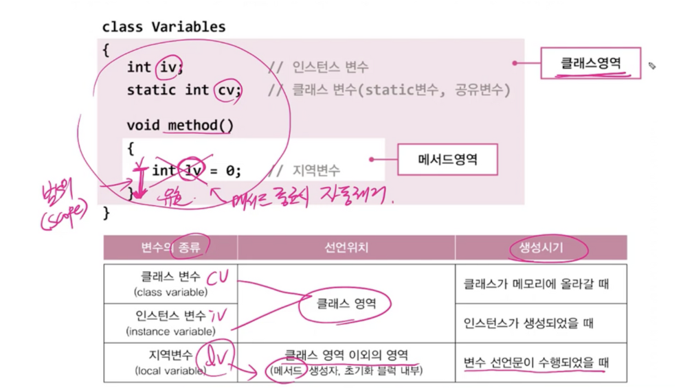 | cv (클래스변수) = static + iv | - 클래스 영역에 속함 |