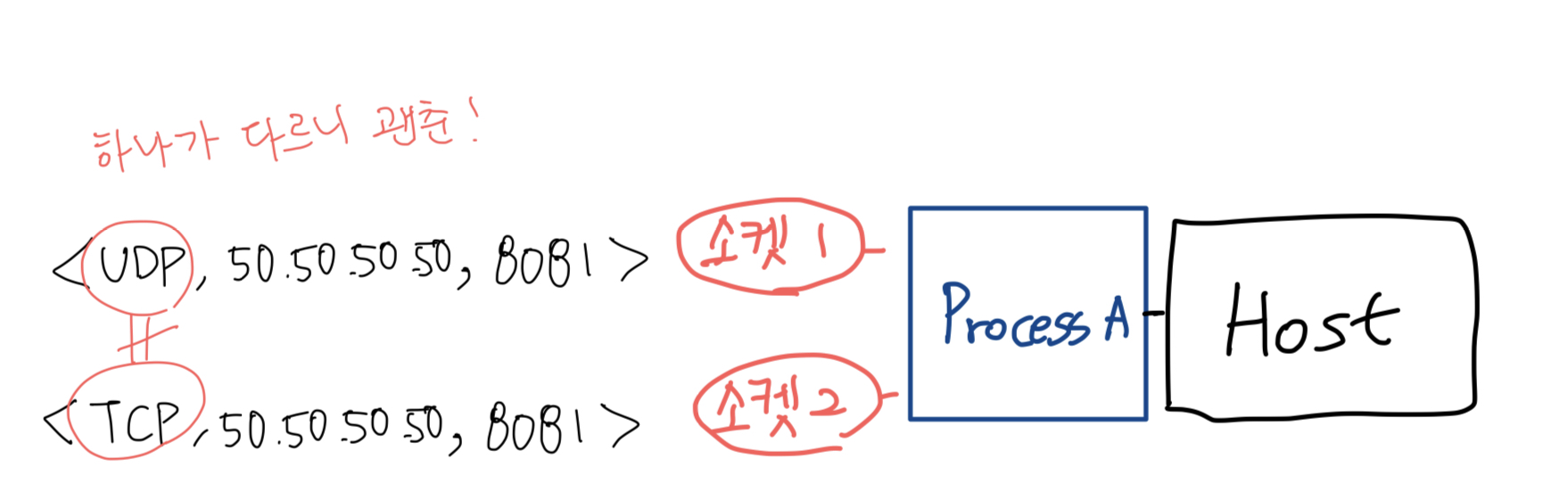 위에서 소켓 식별 방법을 <프로토콜 + IP 주소 + 포트 넘버> 로 정의했는데,