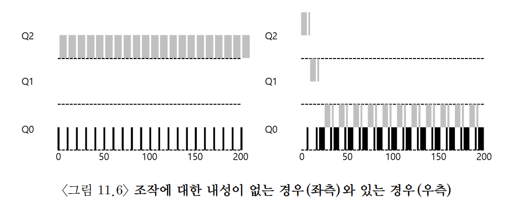 그림 11.2는 타임 슬라이스가 10ms 정도인 경우, 새로운 작업이 들어왔을 때의 우선순위 변화를 나타낸다.