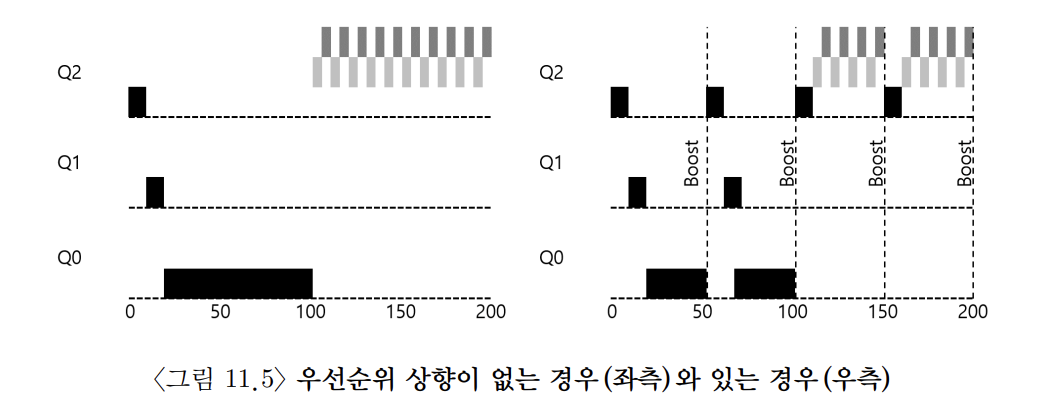 그러나 이 규칙들만으로는 낮은 우선순위의 큐에 있는 작업들이 영영 실행되지 못한다.